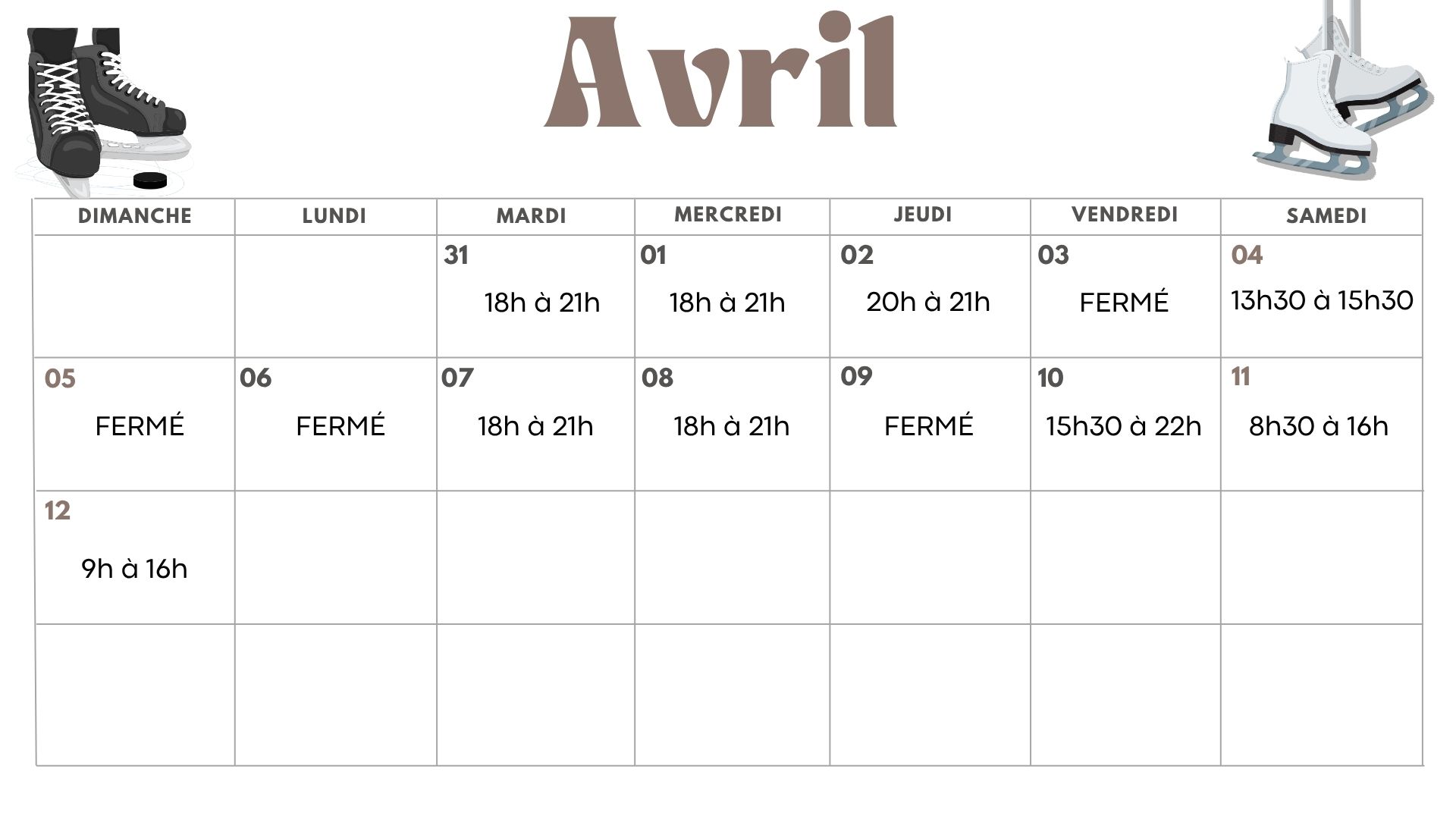 HORAIRE SALLE D'AIGUISAGE DE PATIN (1 au 12 avril)